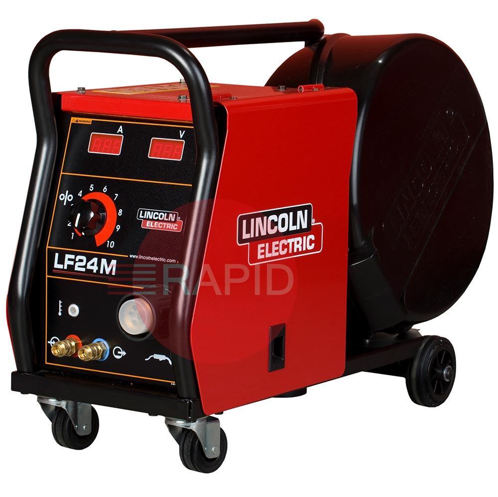 The LF-24M range produced by Lincoln Electric are portable wire feeders with stabilised wire feed speed. These machines include a rugged 4-roll wire feed unit with cold inch, gas purge and a built-in burn-back facility.