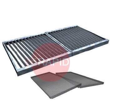 Specially constructed work grid, which is compulsory for plasma cutting applications (current max. 50 A). The plasma cutting work grid consists of two frames with 13 bars each and two additional spark arresters to be mounted over the existing ones in the downdraft table. The additional spark arresters protect the existing spark arresters against melting steel from the plasma cutting process. The bars can be replaced individually.