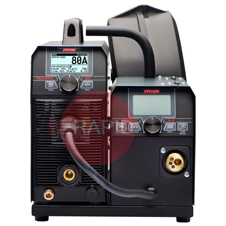 The digital multifunctional welder inverter PATON MultiPRO 350 15-4 is intended for semi-automatic welding with the MIG/MAG method, manual arc welding with the MMA method, and arc welding with the TIG HF method, in a shield of gases and protective mixtures with direct current. These machines operate from a 400V three-phase power supply and have an IP33 protection rating.