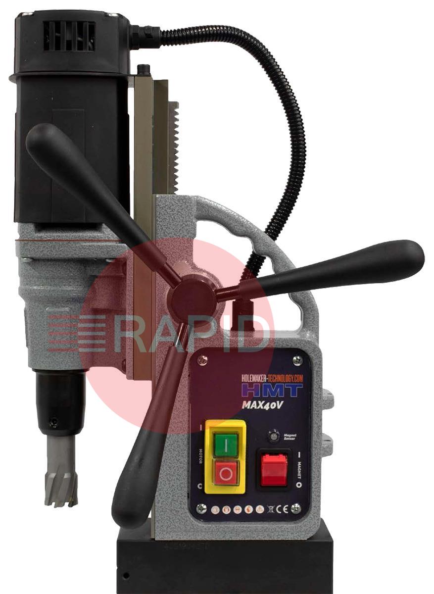 The HMT MAX40V is the ultimate machine designed specifically for lightweight but powerful magnet drilling, broaching and countersinking applications. Built as the upgraded version of the MAX40, the MAX40V provides a 145mm stroke which is almost 50% more than its predecessor. With this increased range the MAX40V comfortably accommodates cutters up to 110mm for deep broaching or the VersaDrive Rapid-Lock Weldon Adapter with VersaDrive tooling, opening up 1,000s of time-saving solutions from the whole VersaDrive system. This huge increase in versatility and functionality comes in a machine that is 10% lighter than the MAX40, at just 10.5Kg and boasts almost double the magnet strength at 1500Kg.  The MAX40V also sees an increase in power with its 1150w motor and offers countersinking up to 25mm, with the ability to take a chuck for added flexibility of use.