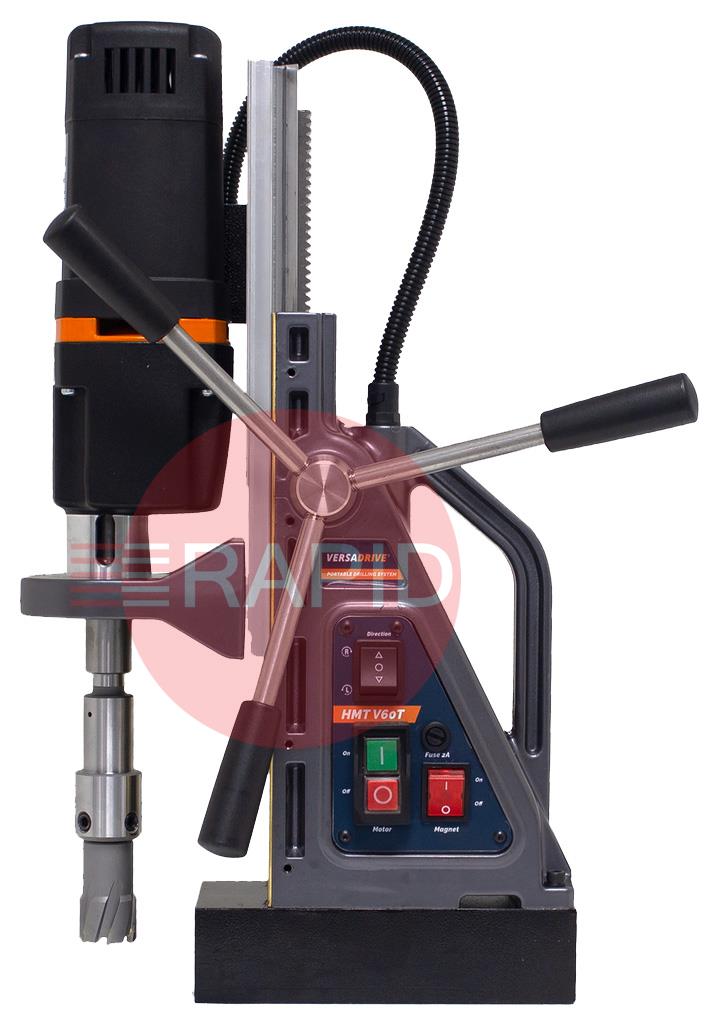 The HMT Steelbor V60T is a portable magnetic drill machine designed to meet high performance and low maintenance to deliver continuous performance in the harshest of drilling and fabrication environments. Being the first UK-made portable drilling machine, the V60T combines lightweight and portability with a high-power all-day broaching capability of up to 60mm in diameter with forward reverse and a variable speed motor that can tap holes up to M20 in diameter. This machine is highly rated for reaming, countersinking, and tapping applications with advanced electromagnets (also made in the UK). These electromagnets can provide a superior magnet hold for better safety and stability.