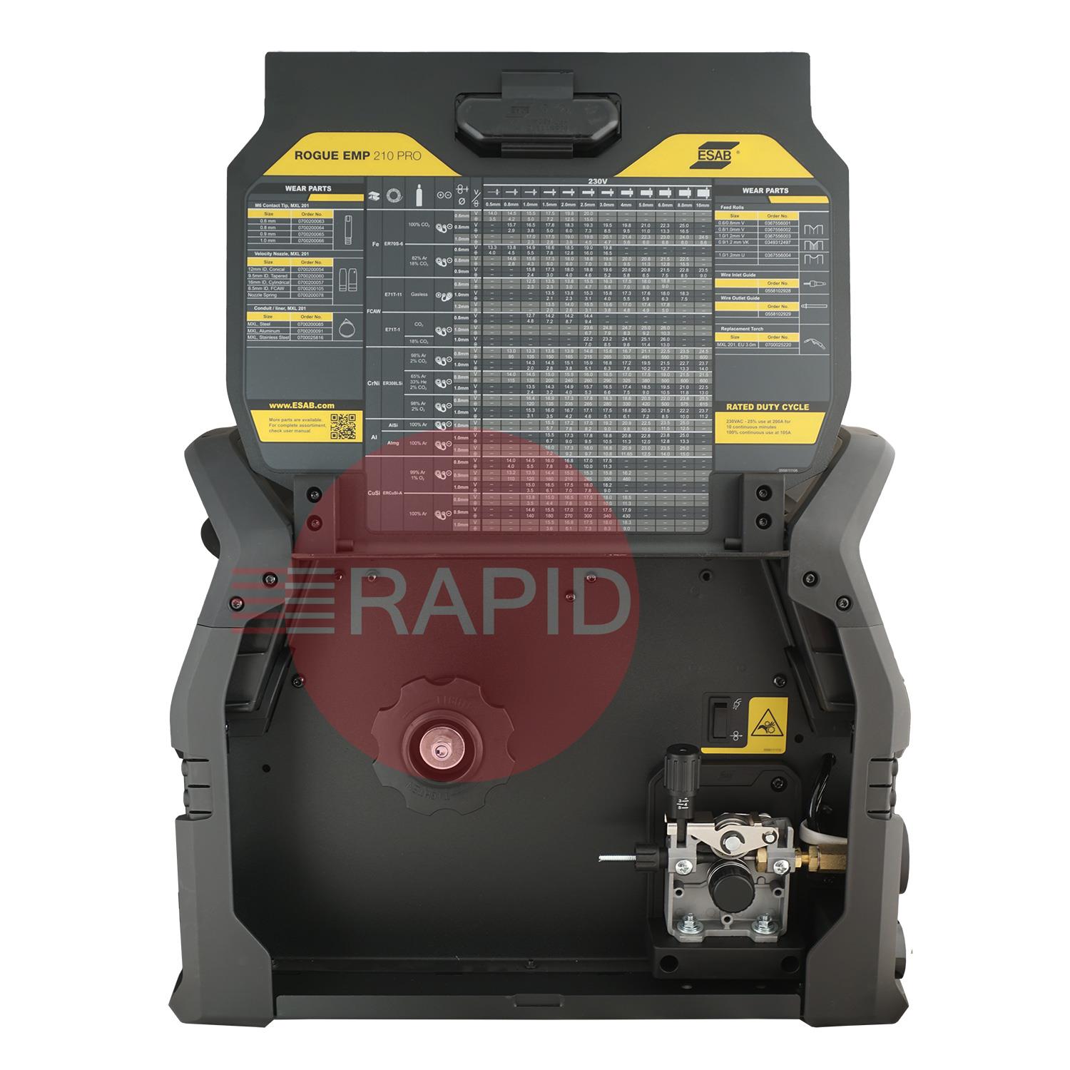 Package includes 3m MXL 201 MIG Torch Euro, return cable kit, 3m OKC 35-50 16mm², 3m Electrode holder Handy 200A heavy duty 50mm OKC, 4.5m Gas Hose with quick connect/open, ESAB OK AristoRod 12.50 0.8mm 1Kg Mig Wire, ESAB GoldRox E6013 Electrodes 2.5x350mm 1Kg, Feed rolls 0.6/0.8mm V (fitted), plus 0.8/0.9mm V and 0.8/0.9mm VK and 3m supply cable.