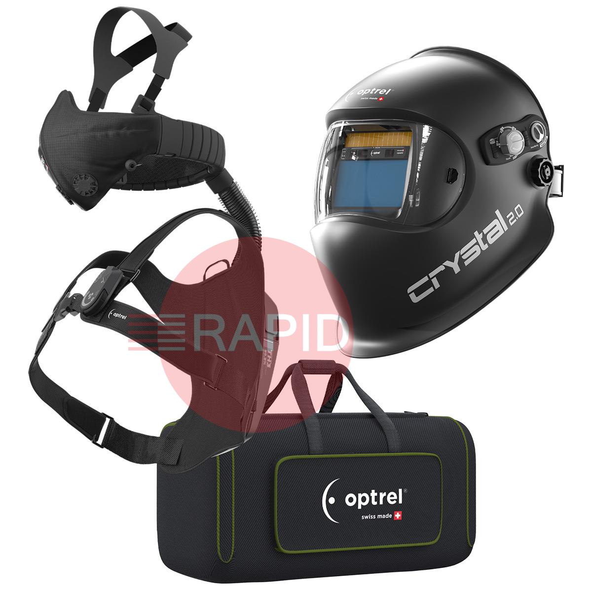 This ready to weld package includes the Crystal 2.0 helmet, the Swiss Air respiratory protection system complete with control panel with comfort half mask: consisting of half mask and hose system. Also included is a head and neck strap, blower unit, 14-hour battery, battery charger (UK, EU, US and AUS adaptors), shoulder harness and storage bag.