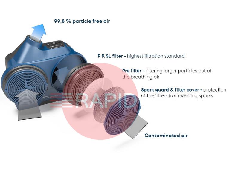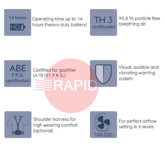 - Advanced PAPR System with Intelligent Airflow Maintain clean, cool, and filtered air throughout your work. The PAPR unit delivers constant airflow (180–240 l/min, six adjustment levels) and high-level filtration (TH3-rated) to protect against hazardous fumes and particulates.